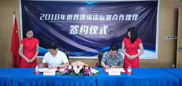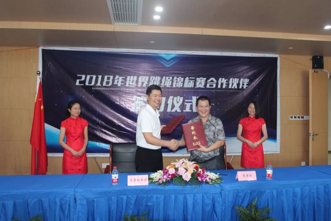 在签约环节,世界跳绳联盟副主席陈阳辉先生作为赛事组委会代表,分别与海尔斯(中国)体育用品有限公司代表王巨冲先生、深圳市赛倍伶科技有限公司代表辜德全先生上台签约。